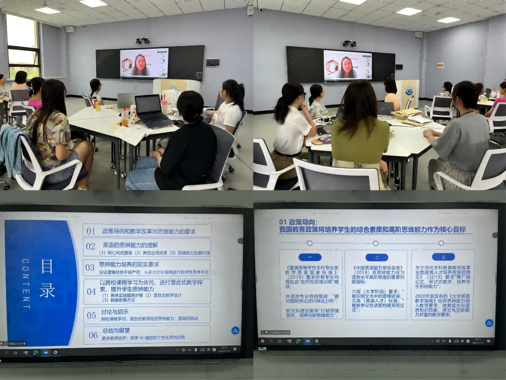 为深化校际教学交流,探索混合式教学模式创新,7月15日,外语教研室教师应邀参加由沈阳工程学院主办的跨校教研会议。本次会议特邀沈阳药科大学高健老师作专题报告,围绕跨校修读课程与思辨能力培养展开深入研讨。