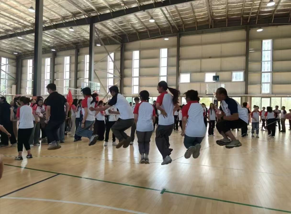 长绳划破空气,发出富有节奏的“呼呼”声。多人跳绳项目在体育馆火热进行。摇绳的老师稳如磐石,掌控全局;跳绳的队员们看准时机,一同起跳,在翻飞的长绳中轻盈跳跃、落下。多人跳绳,考验的是默契与勇气。偶尔的失误并不会带来什么,只有教师队伍的凝聚力在每一次跳跃中升华。