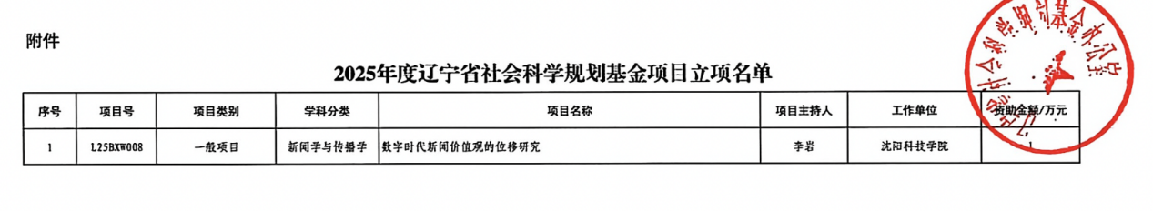 由李岩老师主持的《数字时代新闻价值观的位移研究》获批辽宁省社会科学规划基金项目。