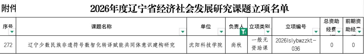 由尚秋老师主持的《辽宁少数民族非遗符号数智化转译赋能共同体意识建构研究》获批2026年度辽宁省经济社会发展研究课题立项
