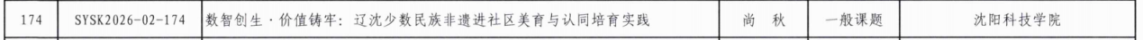由尚秋老师主持的《数智创生·价值助牢:辽沈少数民族非遗进社区美育与认同培育实践》获批2026年度沈阳市文化艺术实践创新类立项课题。